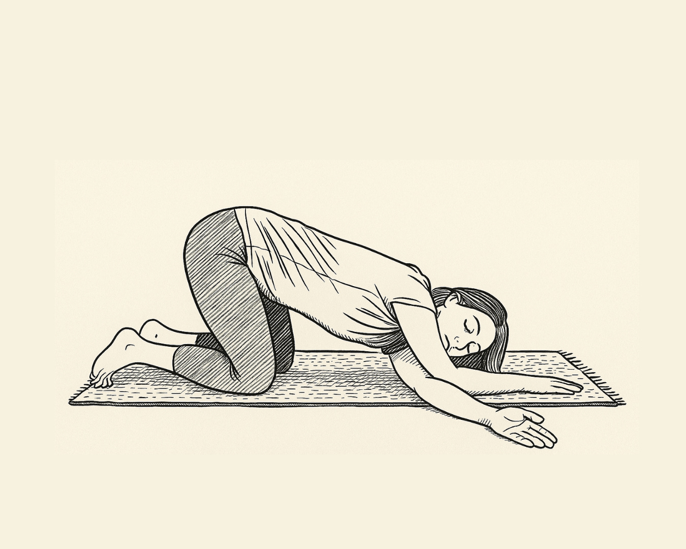 „Thread the Needle“ (Nadel einfädeln): Im Vierfüßlerstand den rechten Arm unter dem linken hindurchführen, bis Schulter und Schläfe den Boden berühren. Tief in den Raum zwischen den Schulterblättern atmen.