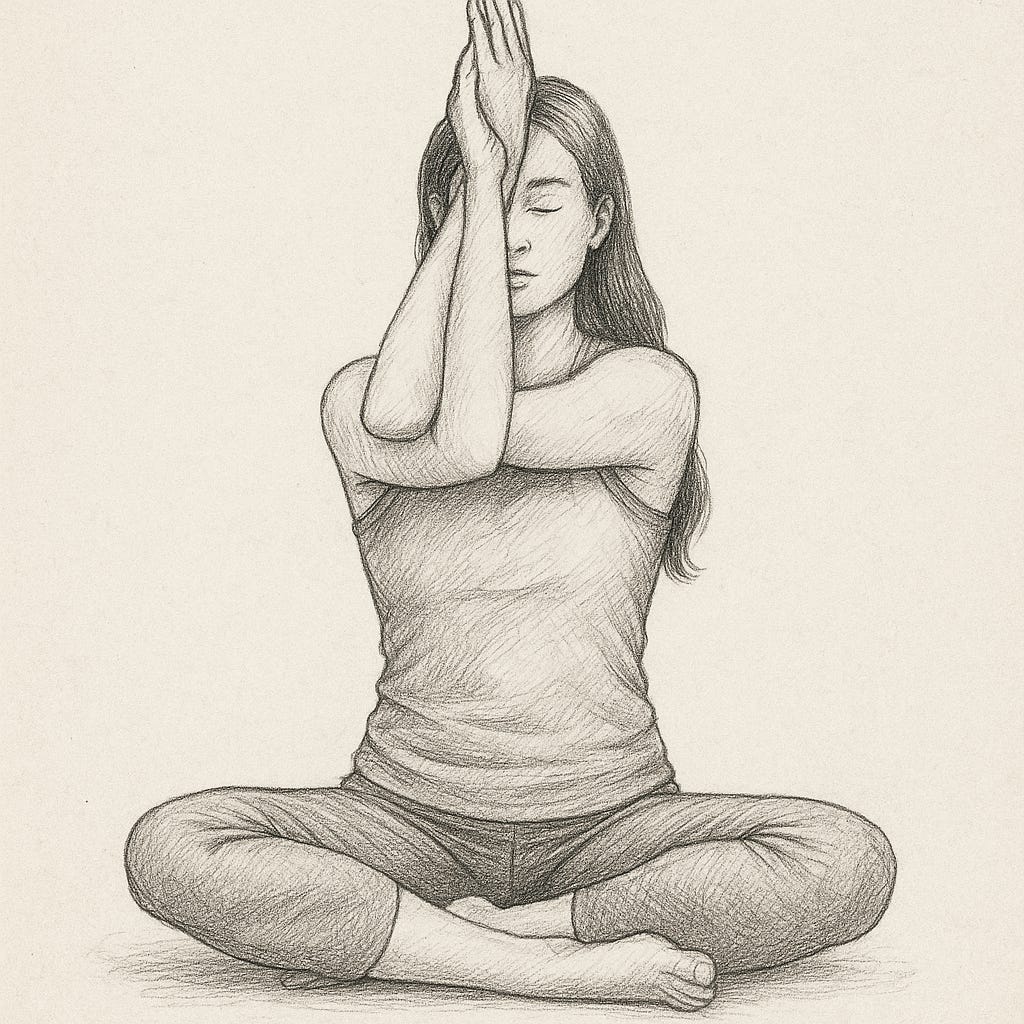 „Eagle Arms“ (Adlerarme): Im Sitzen oder Stehen die Arme nach vorn strecken, rechten Arm unter den linken kreuzen, Unterarme verschränken und Ellbogen sanft anheben. Die Öffnung zwischen den Schulterblättern spüren.